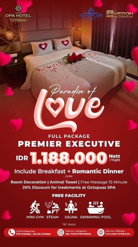 Yusran juga menjelaskan bahwa untuk mendapatkan promo “Paradise Of Love” ini, reservasi bisa dilakukan melalui direct booking melalui telepon di 08153733555, 08541103842 dan 085273322282. Dengan pemesanan langsung ini, Anda akan mendapatkan harga spesial dan layanan terbaik dari OPA Hotel Palembang.